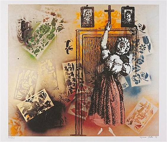 Today I screen printed my chosen edited photograph in numerous different colours on paper and fabric. I plan to collage onto the images to create alternate pieces of work. I am going to sew and glue some things and draw and paint onto them accordingly. This way of working links back to the work of Robert Rauschenburg which I researched during my fine are classes. Like what I am doing, he revolved his work around the time and era of which he created it. Another artist I like and feel like I can relate to is Sigmund Polke. His work is very illustrative. He has bold designs above colourful bold and simplistic backgrounds, both contrasting yet complementing each other.