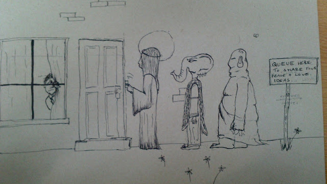 Whilst looking at the texts and pieces of art, I wondered what people thought during the times they were made. The majority of people revolved their lives around religion. This contrasts massively to today and it disappoints me that a lot of people no longer take the time to appreciate the message these old scripts and paintings were made to give out. Today, people are a great deal more close-minded and easily manipulated to other people’s views. To depict these thoughts I am going to start with a quick sketch of my first idea which will eventually evolve into a watercolour. I am going to draw different Gods from different religions all queuing up to a house in the society of today to share the same message. There will be someone at the window peeking round their curtains trying not to be seen. The person will have a lot of frustration on their face. They do not have time to listen to a stranger talk about peace and love. Society today is happier to bury their heads in the sand whilst there is fighting, destruction and famish going on all around them. People take a lot of negativity from religion and extremists have altered people’s views greatly. We forget the positive counselling that their messages can give to us.